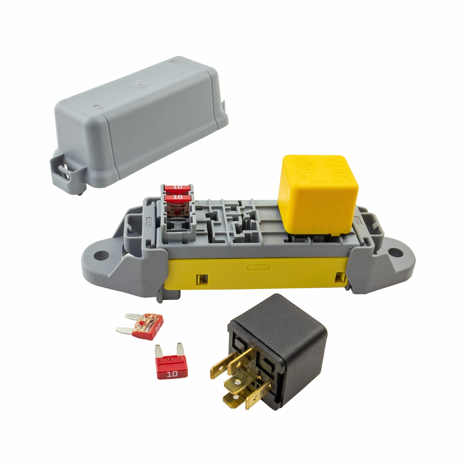 Модульный блок позволяет установить четыре предохранителя типоразмера Мини (MINI) от 2 до 30А и два реле типоразмера Мини (MINI) до 40А, 4-х или 5-ти контактных.