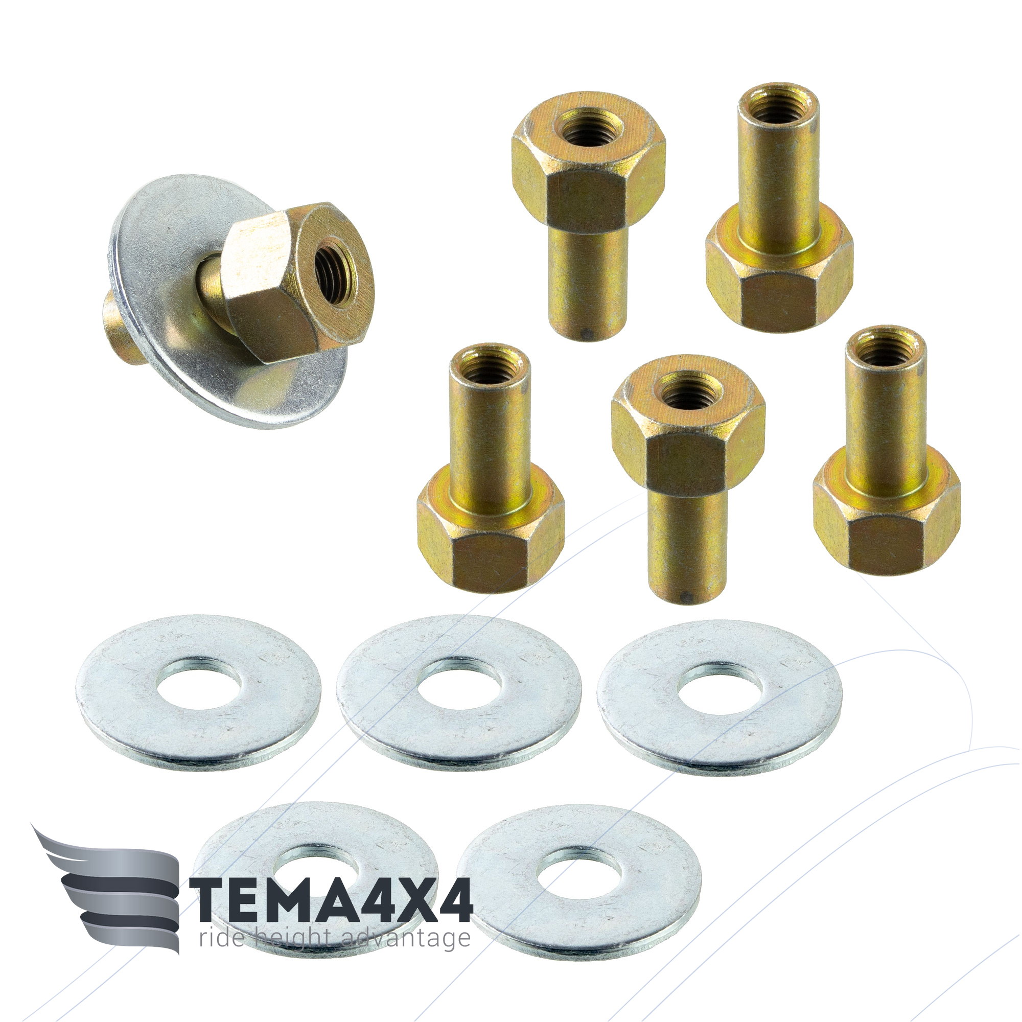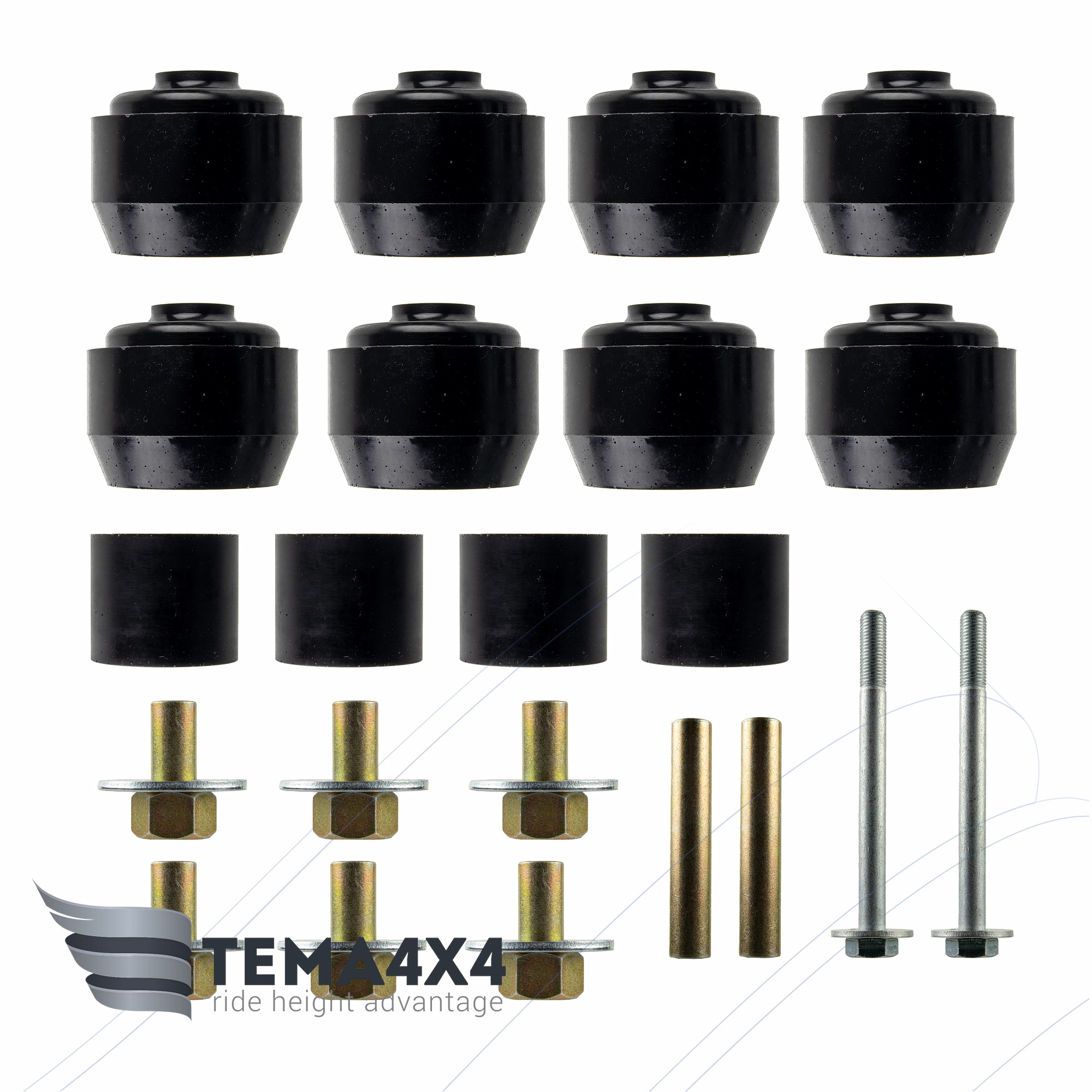 Лифт кузова производится заменой штатных подушек кузова OEM 71511-65D00, 71511-52D00 и промежуточных опор OEM 71521-56B00 на увеличенные полиуретановые средней твердости. Это даёт подъём кузова над рамой на 1" (25 мм).